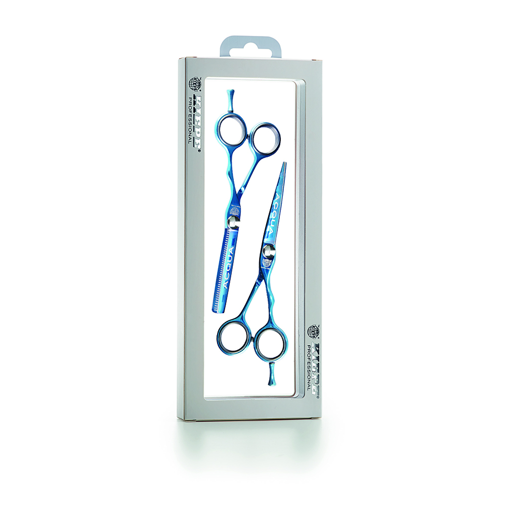 Регулировочный винт имеет малую высоту относительно плоскости поверхности ножниц и оснащён системой MINI CLICK для лёгкости регулировки натяжения полотен. Прямые ножницы предназначены как для классической стрижки, так и для слайсинга. Филировочные ножницы имеют 38 зубцов (по 3 насечки на каждом) и пркрасно подходят для классических филировочных работ. Парикмахерские ножницы модели Kiepe ACQUA имеют высококачественное титановое покрытие, что обеспечивает не только их оригинальный дизайн, но и придаёт им высокие антиаллергенные свойства. Пара оснащена съёмными упорами для мизинца и съёмными пластиковыми кольцами.