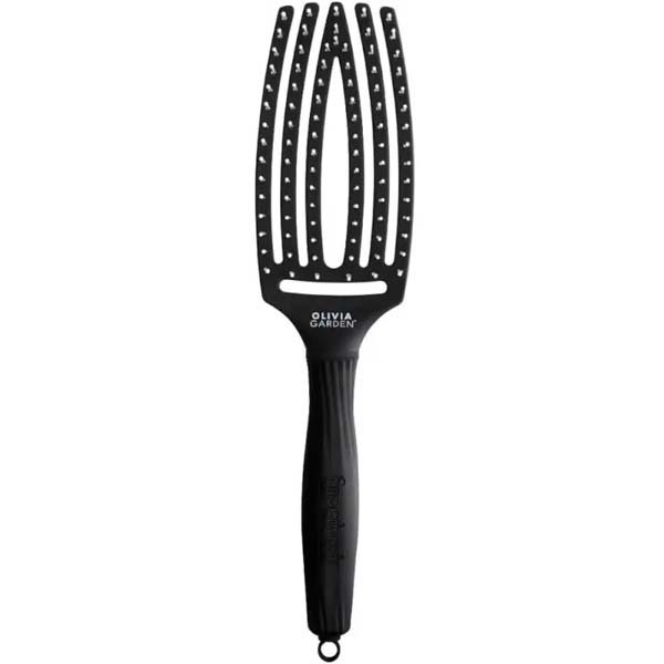 Массажная щётка Fingerbrush от Oliviа Garden изогнутой формы с щетинками из термостойкого нейлона обеспечивает бережное расчесывание волос и массаж кожи головы.